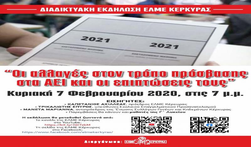 Διαδικτυακή εκδήλωση ΕΛΜΕ Κέρκυρας: "Οι αλλαγές στον τρόπο πρόσβασης στα ΑΕΙ και οι επιπτώσεις τους"