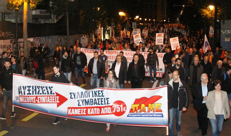Με συνθήματα να δονούν την ατμόσφαιρα όπως, «Εργάτη μη μειώνεις τις απαιτήσεις, στους ταξικούς αγώνες βρίσκεται η λύση» και «Συμβάσεις κλαδικές, αυξήσεις των μισθών, είναι η απαίτηση των εργατών», ολοκληρώθηκε έξω από τη Βουλή το βράδυ της Τρίτης 20 Μάρτη το μεγάλο συλλαλητήριο Σωματείων και Ομοσπονδιών που ανταποκρίθηκαν στο κάλεσμα του ΠΑΜΕ, για ΣΣΕ με αυξήσεις στους μισθούς, εργασιακά και ασφαλιστικά δικαιώματα, κόντρα στις επιδιώξεις της κυβέρνησης, της εργοδοσίας και των συνδικαλιστών τους για εδραίωση και επέκταση της εργασιακής ζούγκλας. Αγωνιστικές κινητοποιήσεις πραγματοποιήθηκαν ακόμα σε Πειραιά και άλλες πόλεις ενώ γίνονται και την Τετάρτη σε διάφορες πόλεις (Διαβάστε ΕΔΩ αναλυτικά).